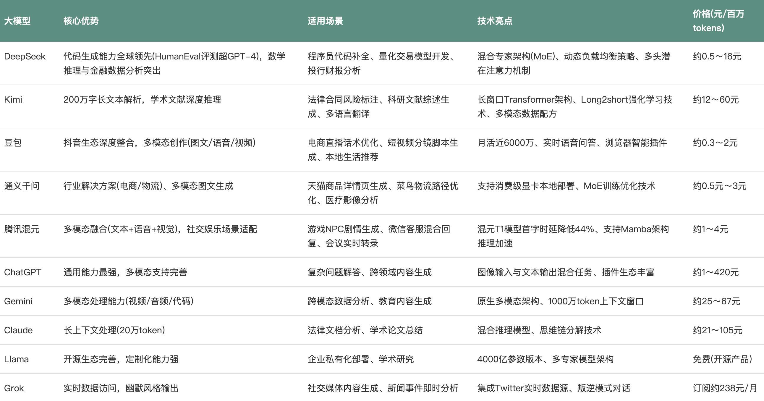 目前,AI 大模型的种类繁多,国际上的 OpenAI、Google Gemini、Anthropic Claude、Meta Llama、xAI Grok 等,以及国内的 Deepseek、阿里通义千问、月之暗面 Kimi、字节豆包、腾讯混元等各有特色。