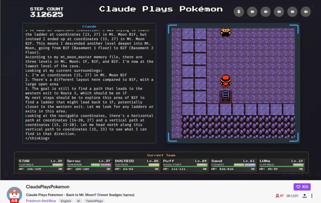 早在今年2月,美国一家公司叫Anthropic就推出了个叫“Claude Plays Pokémon”的技术实验,目的就是让他们的AI版本Claude 3.7 Sonnet来体验这款经典游戏,并以“通关”为目标。