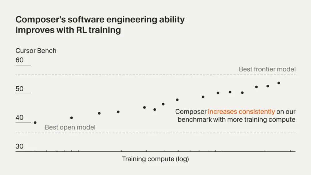 Composer 是一款前沿的模型,尽管在智能程度上未能超越 GPT-5 等顶尖模型,但其生成速度却是同类模型的四倍,领先于市场。