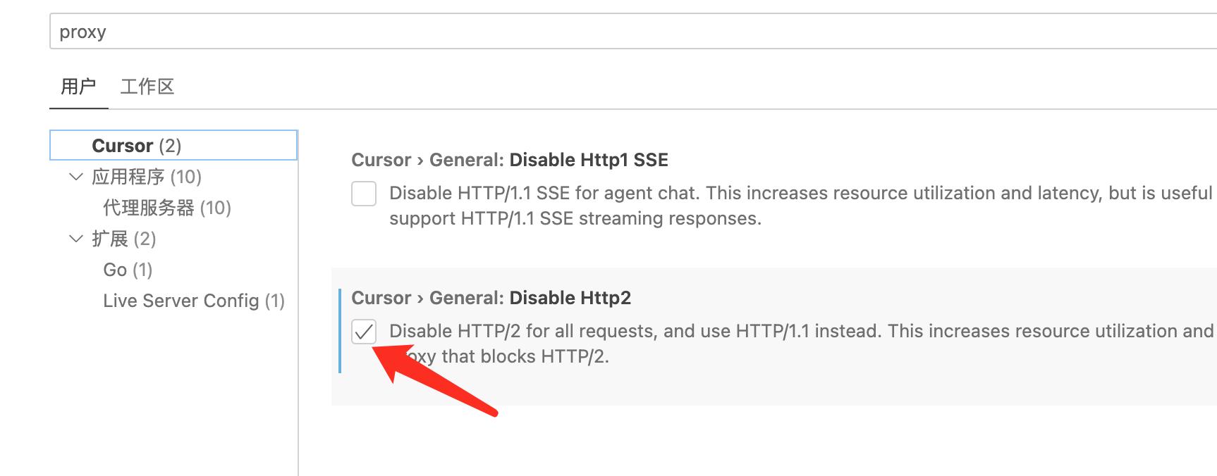 - ✅ 关闭 Cursor › General: Disable Http2: