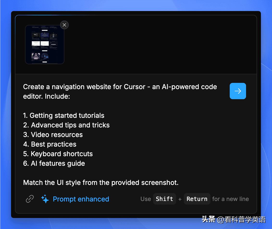 上传参考网站的截图,输入提示词后,点击输入框下面的 “Enhance prompt” 按钮,然后回车。