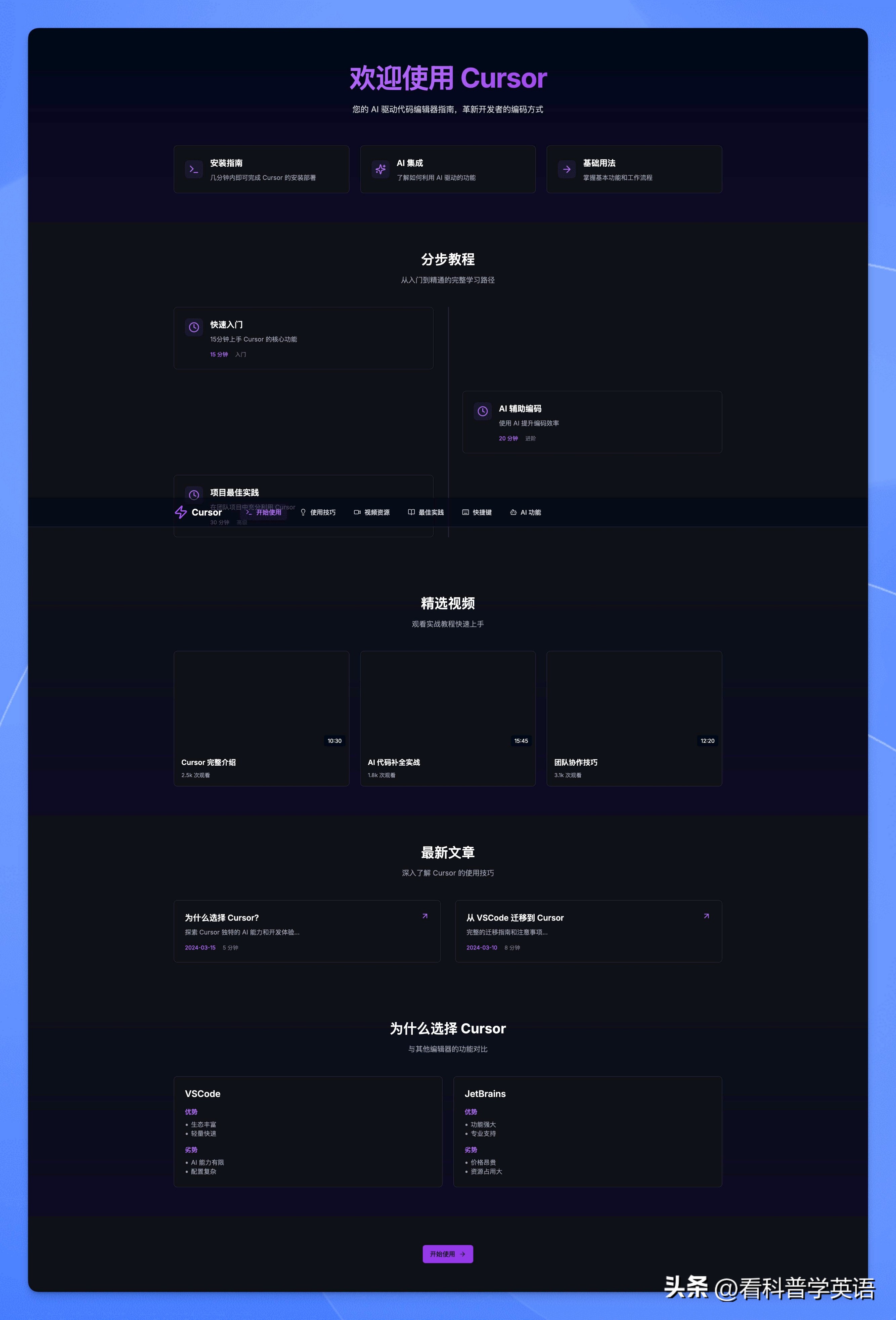 参考我上传的截图给我生成一个 UI 风格一致的导航站,导航站的主题是“集成了 AI 技术的强化型代码编辑器 Cursor”的各种入门教程和实用技巧以及视频资源。