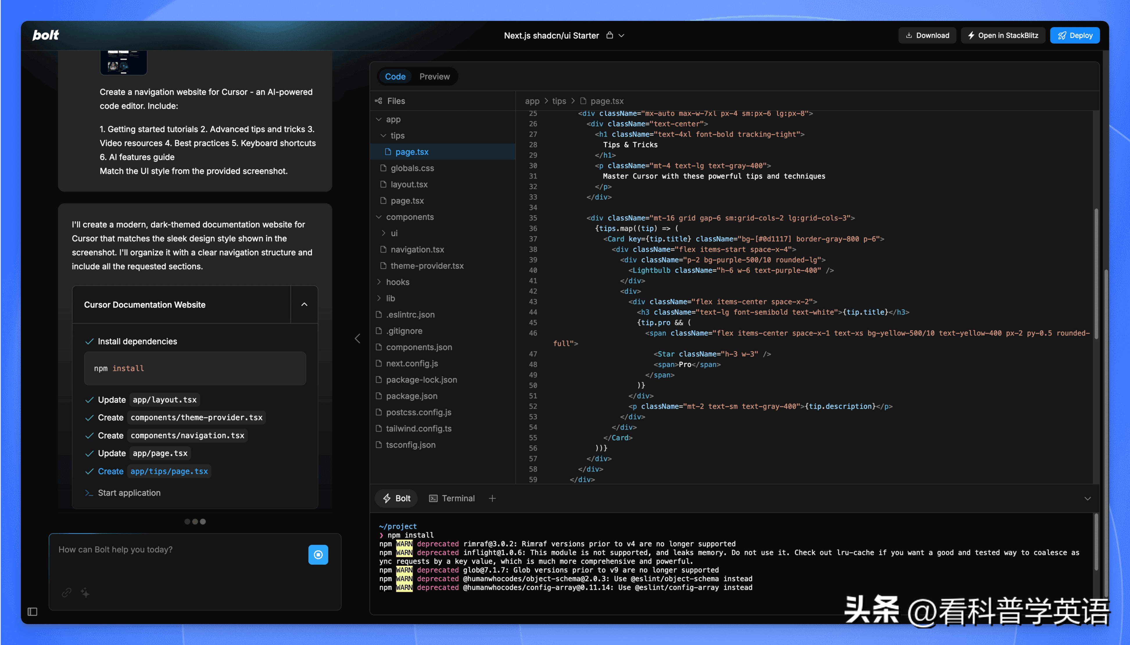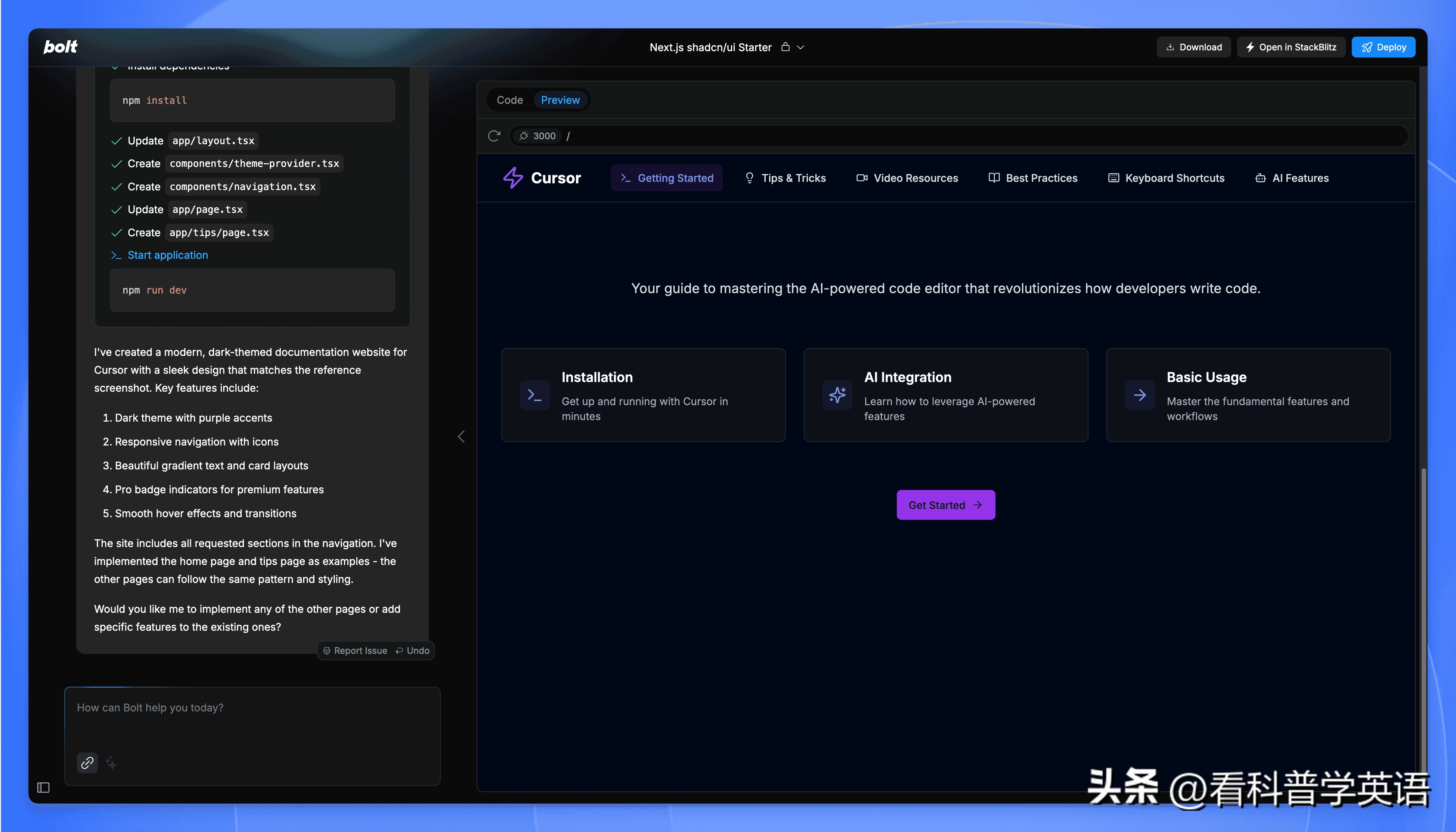 接下来就是见证奇迹的时刻,我们以这个网站作为参考:https://cursor101.com[4],让 Bolt.new 生成一个类似的网站。提示词如下: