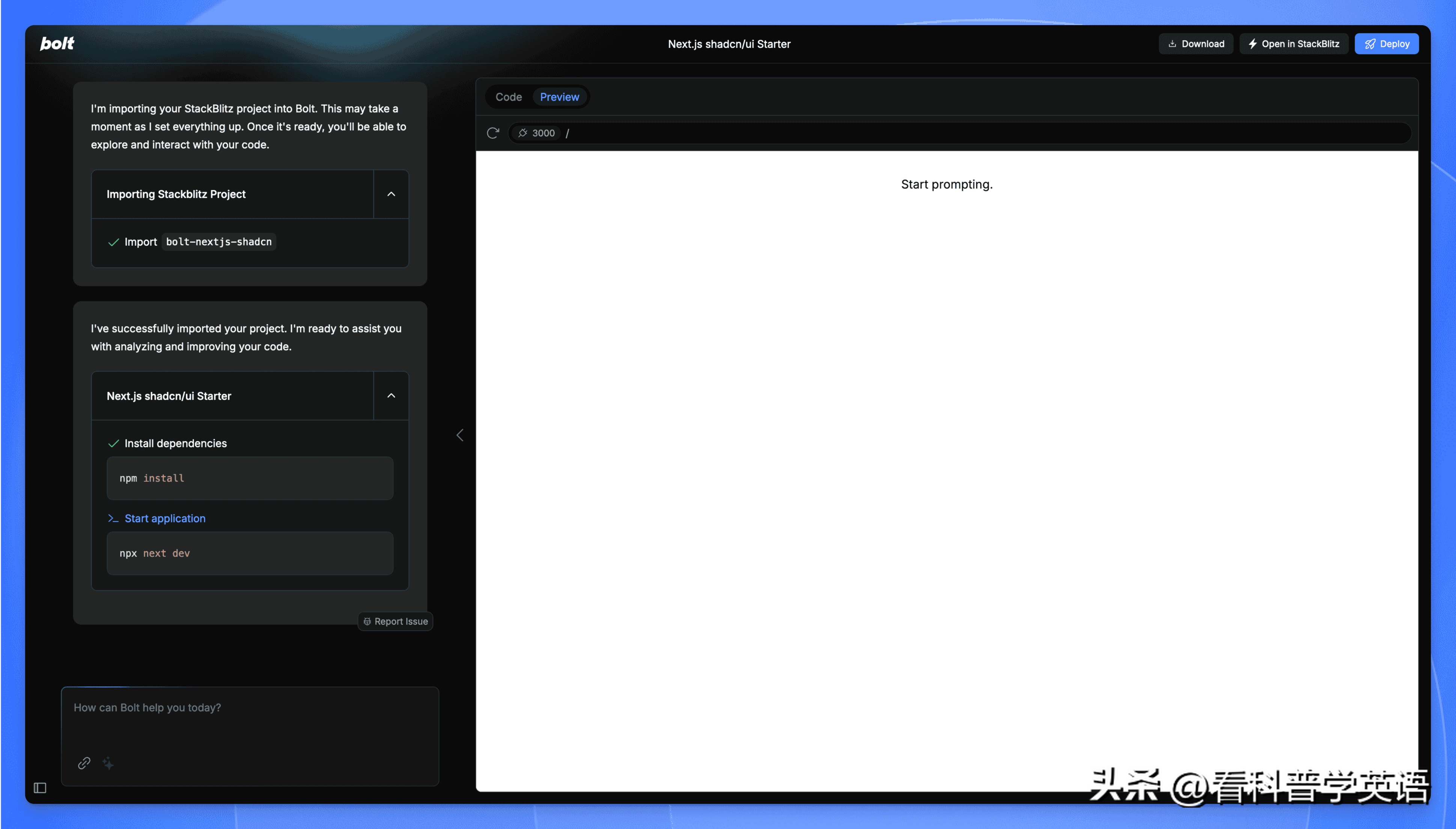 在这里,你既可以输入提示词来初始化你的项目,也可以在 “or start a blank app with your favorite stack” 下方选择你喜欢的技术栈,然后点击它。