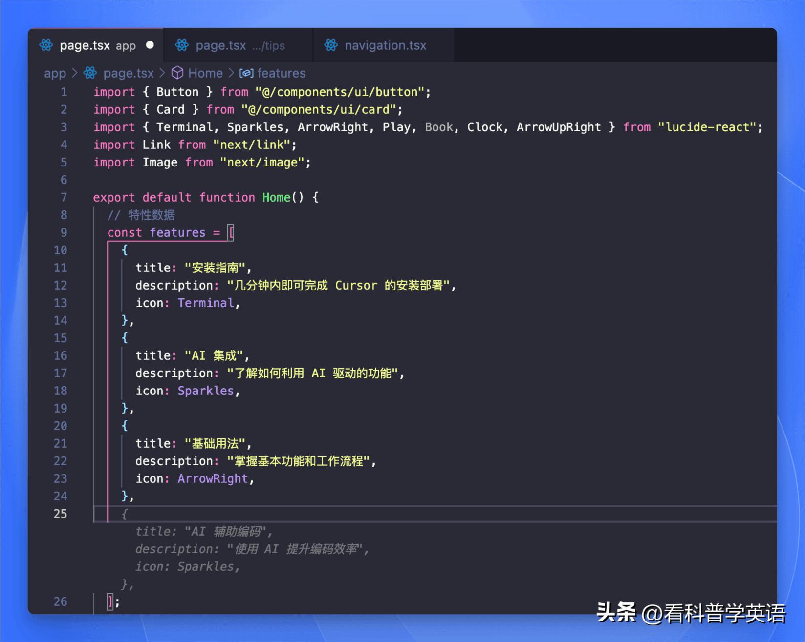 前面我们提到,Cursor 最牛逼的是可以直接修改你的代码。它20250;根据光标所在的位置,自动生成代码补全建议,用户直接通过 Tab 键就可以完成代码补全 (当然 GitHub Copilot 也能补全,我们来说点不一样的)。