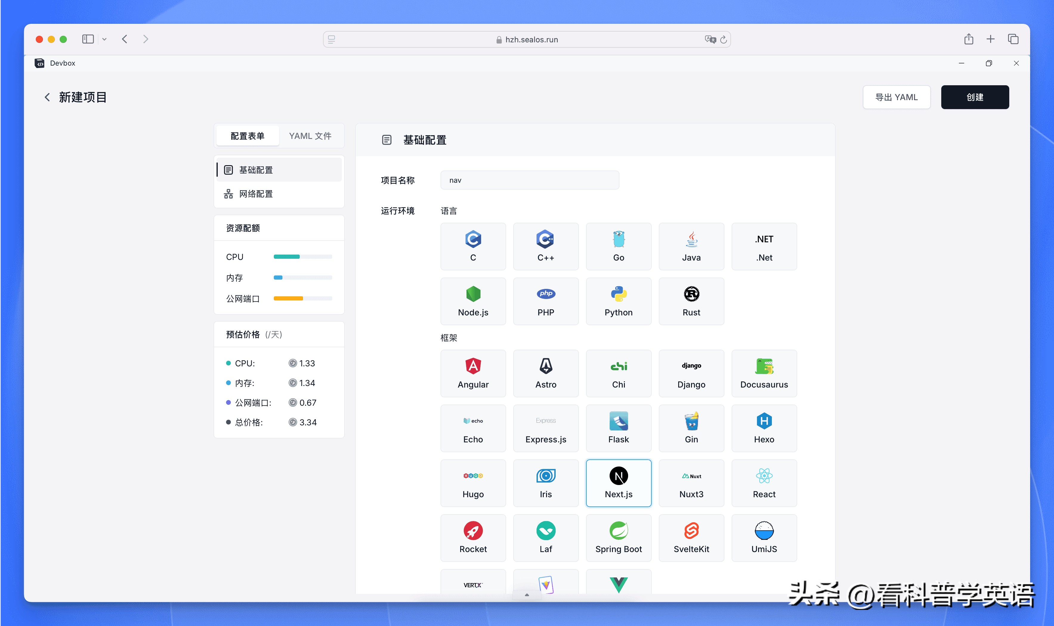 首先进入 Sealos 桌面[2],然后打开 Debox 应用,创建一个新项目,选择 Next.js 作为运行环境。