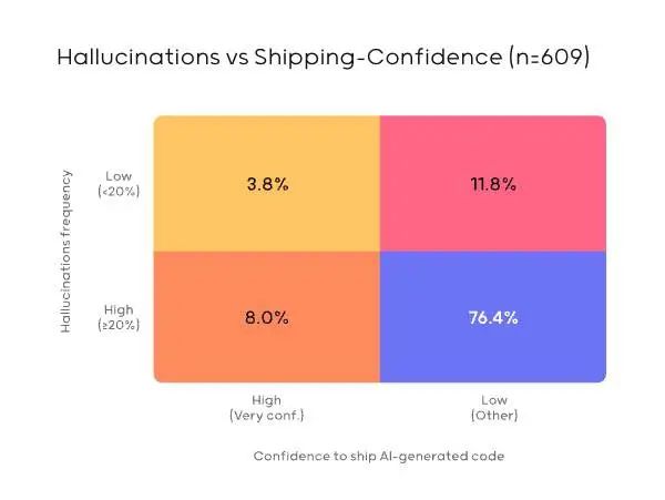 上下文工程的崛起,最早可以追溯到一个名为 Qodo 的团队。不久前,他们进行了一项关于 AI 生成代码质量的研究(2025 State of AI code quality)。该调研涵盖大量开发者,其中一个令人瞩目的结果是:76.4% 的开发者表示,他们对未经人工审核的 AI 代码缺乏信任。主要原因在于 AI 仍然容易出现幻觉和错误,这也成为其实际应用的一大障碍。