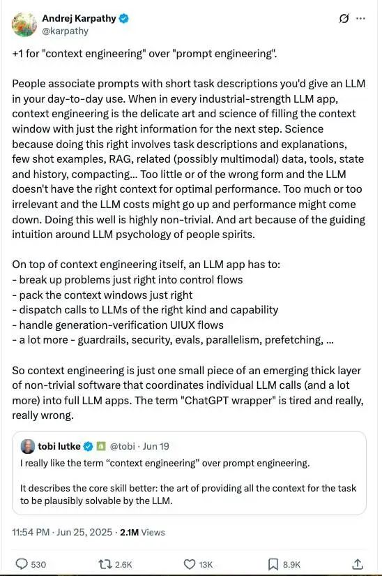 Karpathy 进一步强调,我们已经不再处于“谁能写出更精妙的提示”这一阶段。核心在于“上下文工程”,即如何有策略地设计、组织和传递最合适、最准确的信息,以最大限度地发挥大型模型的潜力。