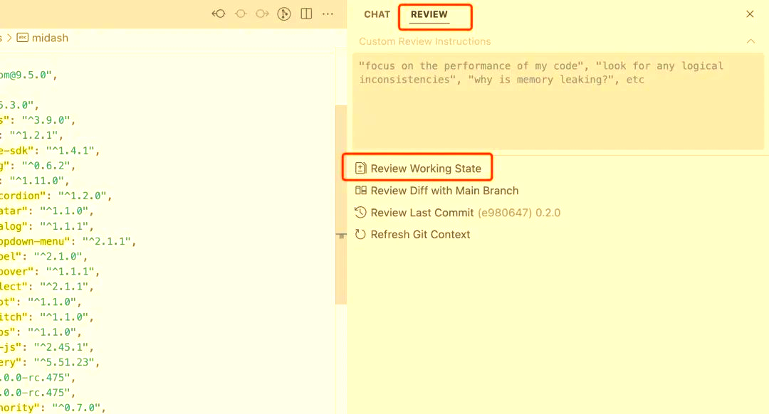 此外,在日常使用Cursor编辑器时,可能会面临一个挑战:在利用Tab键进行自动补全或Chat功能时,偶尔会不慎删除关键代码行。这类细微改动往往不易被常规代码审查所察觉,却可能引发重大程序错误。为此,Cursor提供了Review面板功能,该功能可实时监控代码变动,助力我们迅速发现并纠正潜在问题。