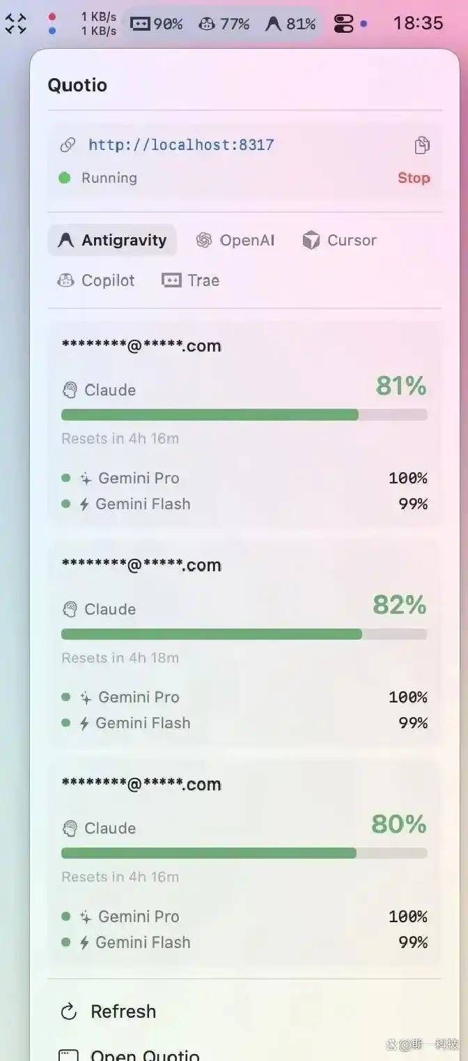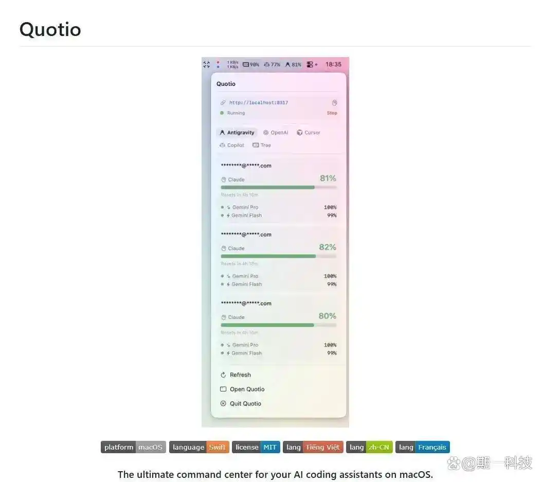 最近,我在GitHub上发现的开源工具Quotio,仿佛是为解决这一问题量身定制的“安抚剂”。它的外观设计让人眼前一亮:一个完美融入macOS菜单栏的小图标,直观地以“电量条”的形式展示每个AI账户的剩余额度。这种美学设计,实质上是对开发者心理的呵护。通过它,你能够一眼看出“弹药”的存量,成功缓解了我的额度焦虑。历史上类似的设计理念,比如苹果早期对用户体验的极致追求,都是为了减轻认知负担,让用户的注意力回归到重要任务上。