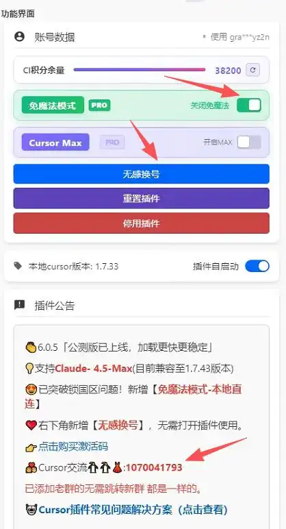 2. 无感换号:若在使用过程中提示额度不足,点击插件或会话右下角的无感换号按钮即可自动切换账号,原窗口仍可继续使用,上下文信息不会丢失。