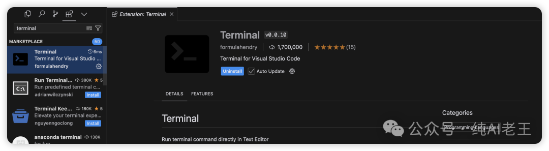 Terminal 插件允许用户在窗口中直接打开命令行,非常方便地执行各种程序。