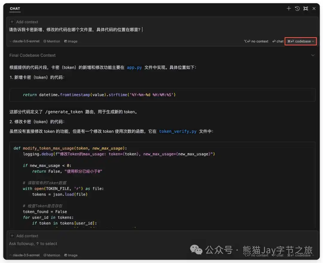 请注意,使用时点击 codebase,这样 Cursor 就会在整个代码库中进行搜索。当我们不确定代码位置时,这一功能优于传统工具。