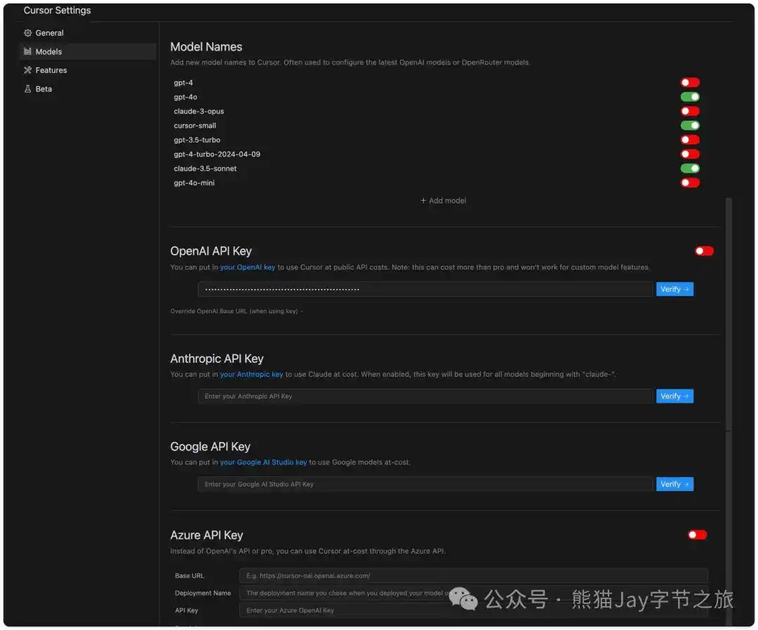 在模型支持方面,Cursor 拥有代码领域顶尖的大模型Claude3.5,同时也兼容GPT-4与GPT-4o,并允许用户配置Google、Azure的API Key。