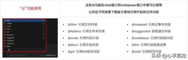 我经常利用 @ 功能,将一堆难以理解的文献或代码文件存放在一个文件夹中,然后使用 @codebase,这样工具就可以自动识别该文件夹中的所有文件,无需我逐个导入,让 AI 知道要查看的内容,简直是极其方便!