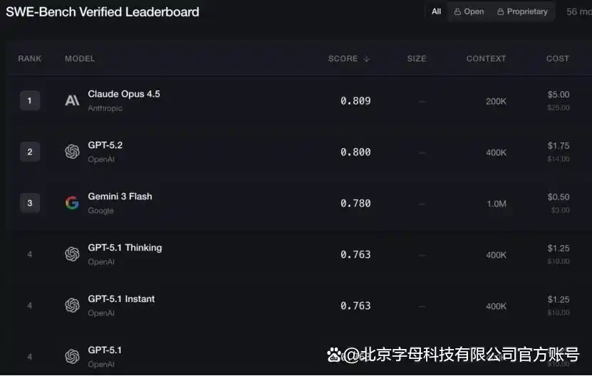 SWE-Bench Verified排名前五的模型分别来自于Anthropic、OpenAI和谷歌。