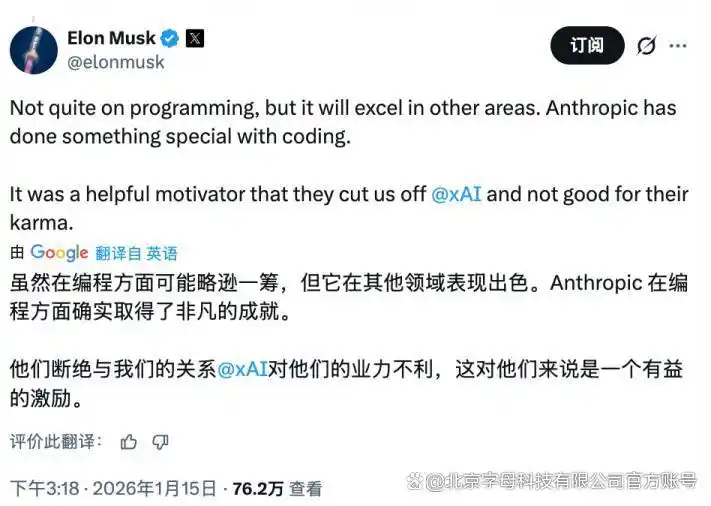 在一月,马斯克首次在X上公开承认Grok在编程能力上不及Anthropic的Claude。