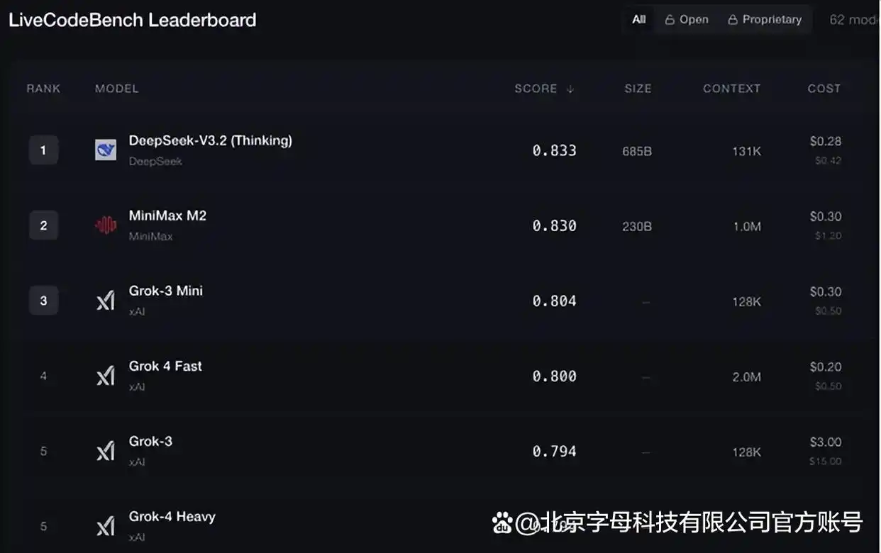 在Live Code Bench中,xAI表现相对优异,Grok-3 Mini、Grok 4 Fast和Grok-3分别位列第三、第四和第五。该基准测试涵盖全面且干净的大型代码语言模型评估,持续收集编程竞赛中的新问题,以考察模型在训练截止后发布的新问题的解决能力。
