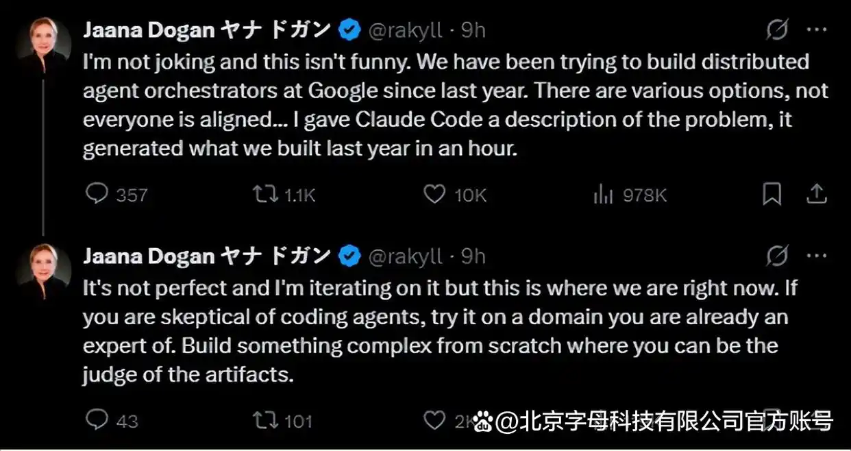 谷歌的首席工程师,同时也是Gemini API的负责人Jaana Dogan,近日透露,她仅用简短的提示词和一个多小时的时间,就借助Claude Code完成了相当于过去一年工作量的成果。