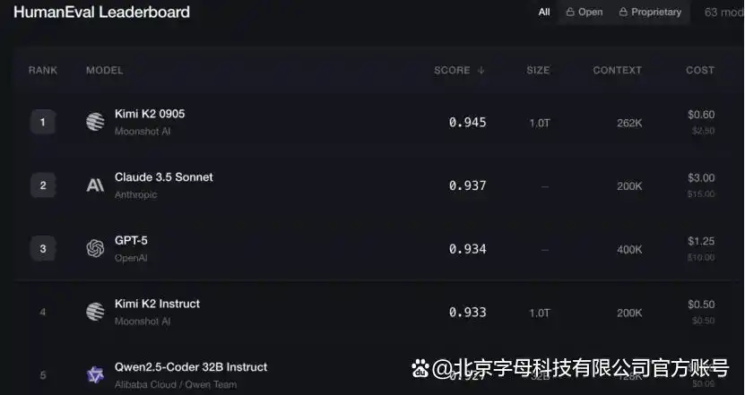 Human Eval排名前五的模型分别来自Kimi、Anthropic、OpenAI和阿里。