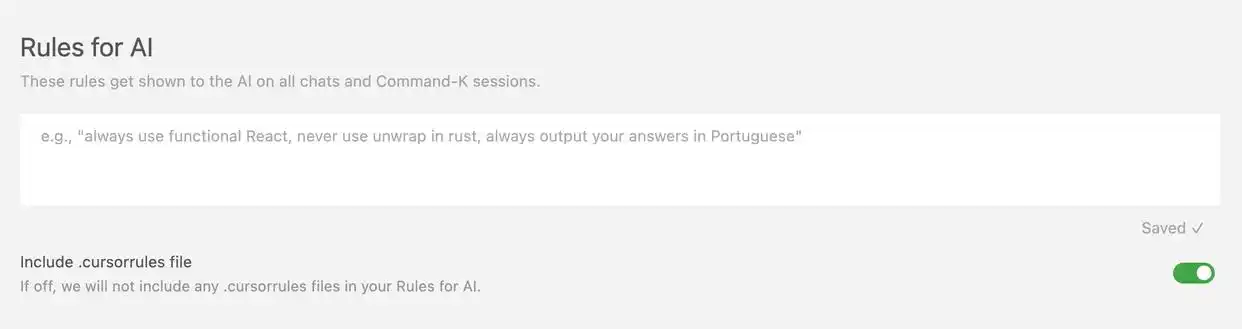您能够通过修改 Cursor Settings > General > Rules for AI 来向 Cursor 添加自定义指令。