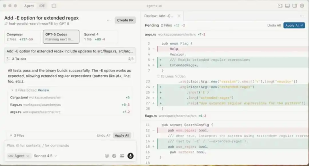 如今,用户可以轻松地查看Agent在多个文件中所作的所有更改,而不必频繁切换不同的文件。