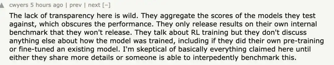 “Composer缺乏透明度的情况实在让人无法理解。他们提到采用了强化学习,却未说明模型的其他训练细节——究竟是自主预训练的,还是基于现有模型进行修改?在公开更多信息或有人能够独立验证之前,我对这些说法持怀疑态度。”