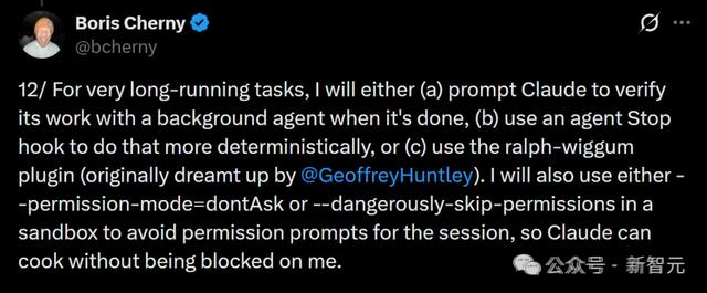 在第12部分中,Boris提到针对运行时间较长的任务,他通常采用以下几种策略,其中之一就是使用ralph-wiggum插件。