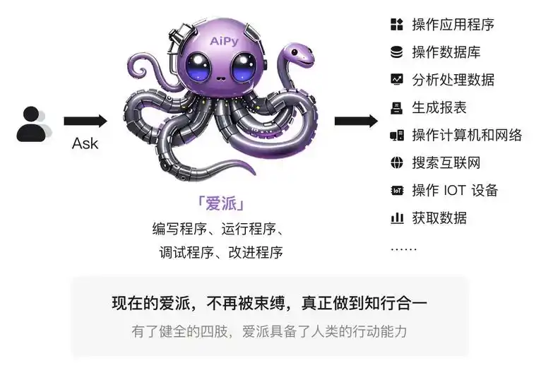 爱派(AiPy)是由国内安全厂商知道创宇推出的一款通用人工智能体。其目标是通过大型语言模型与Python编程、运行及控制相结合,实现智能化的应用。