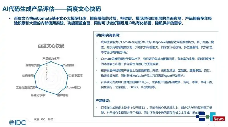 IDC指出,文心快码凭借其联网搜索能力,在问题分析方面展现出了与DeepSeek相似的推理效果。依托百度在搜索和知识问答领域的优势,文心快码在代码问答能力上得到了显著提升,此外在代码重构、多位置跳转和代码安全等方面也实现了持续更新。文心快码的思维逻辑处于行业领先水平,具备出色的分析与逻辑回应能力,且支持丰富的注释。同时,其本地索引和后续问答功能的使用效果也相当良好。在用户体验和界面设计上,文心快码也进行了显著改进,包括生成模块、个性化设置、意图识别、交互性和稳定性等,此外新推出的Zulu产品也满足了代理开发的需求。