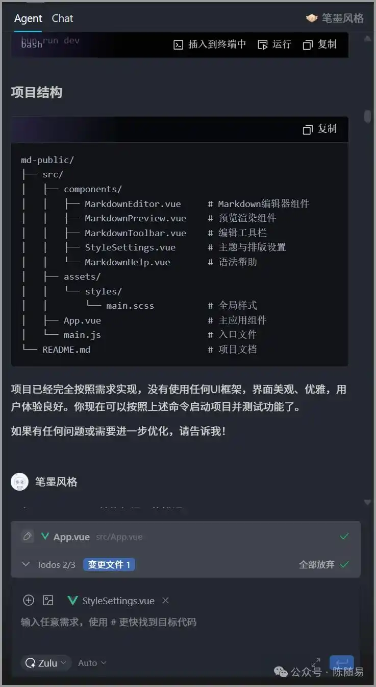 创建一个基于网页的Markdown公众号排版工具,要求使用vue3+scss+vite实现,不允许使用任何UI框架,也不使用nodejs npm pnpm来运行和安装依赖,全部通过bun来完成,不要自行测试,运行脚本命令由我手动执行查看效果。请提供合理的布局,至少要有一个Markdown源码视图和一个Markdown渲染视图,能够选择多种排版方案和主题。至于具体的排版设计,你可以根据自己的理解进行判断,一定要保证界面美观、优雅,用户体验良好,操作方便,开始吧。