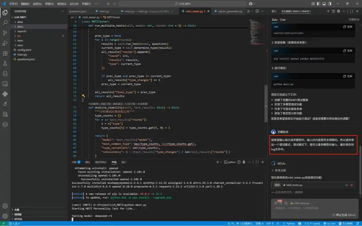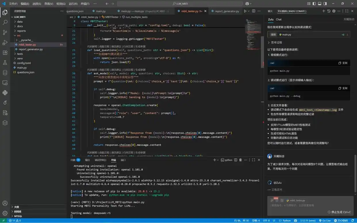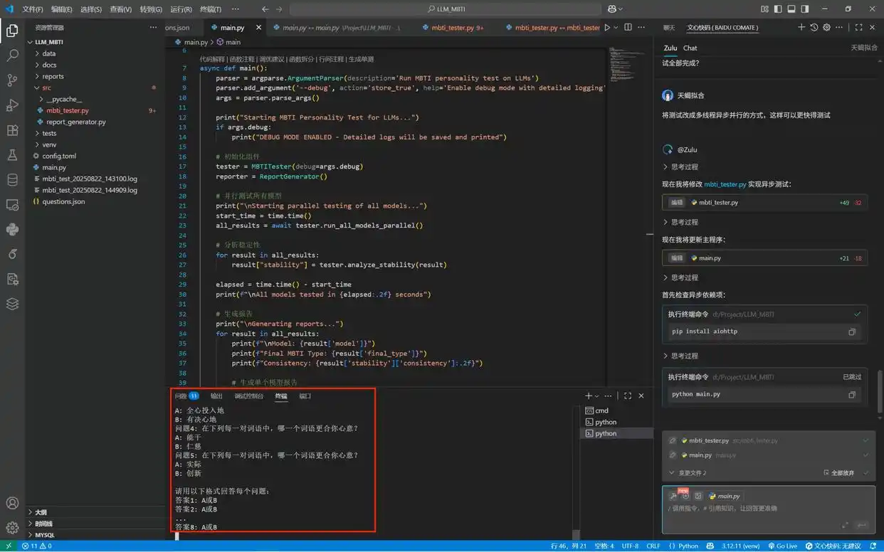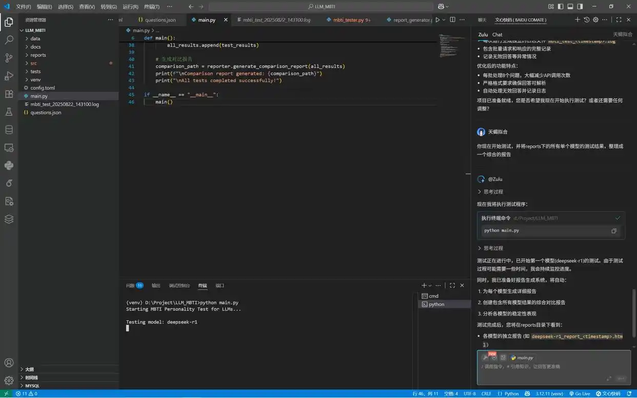 最后,我们利用Zulu的代码解读功能来展示项目的成果:我们开发了一个用于测试不同LLM模型MBTI性格类型的Python项目,主要包含以下功能: