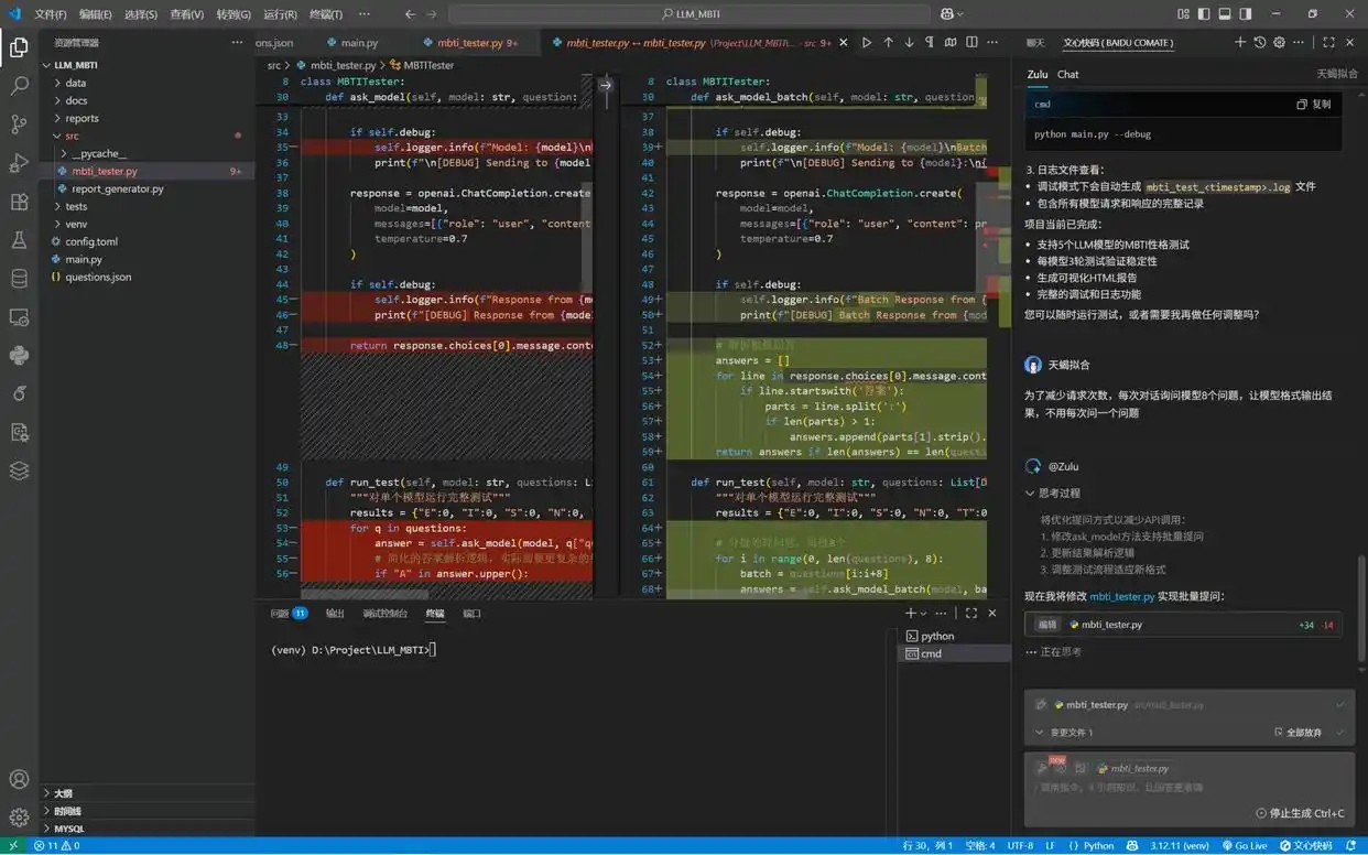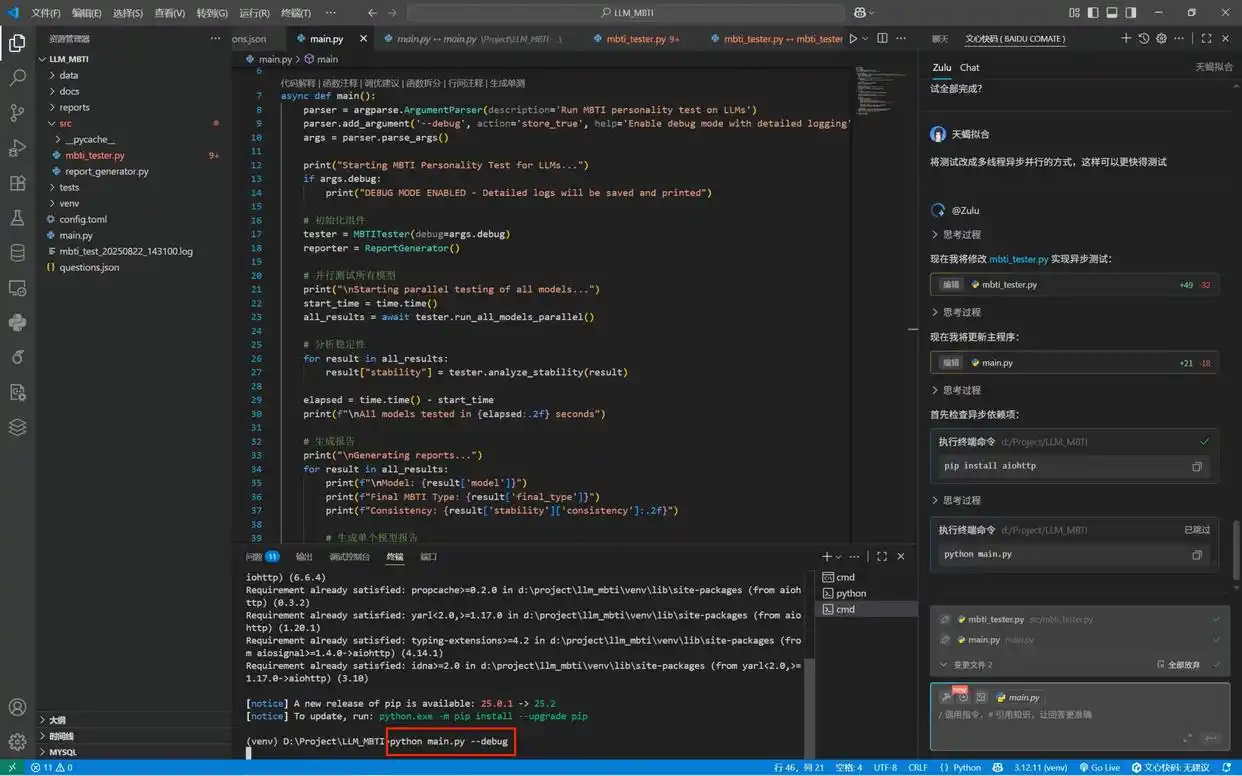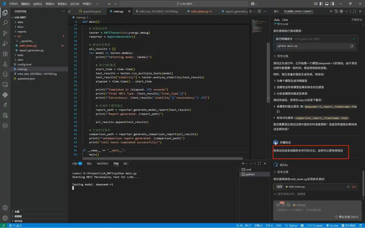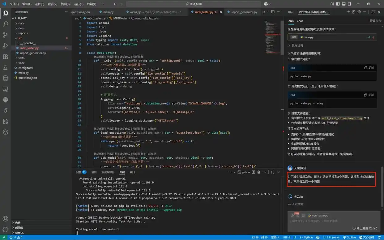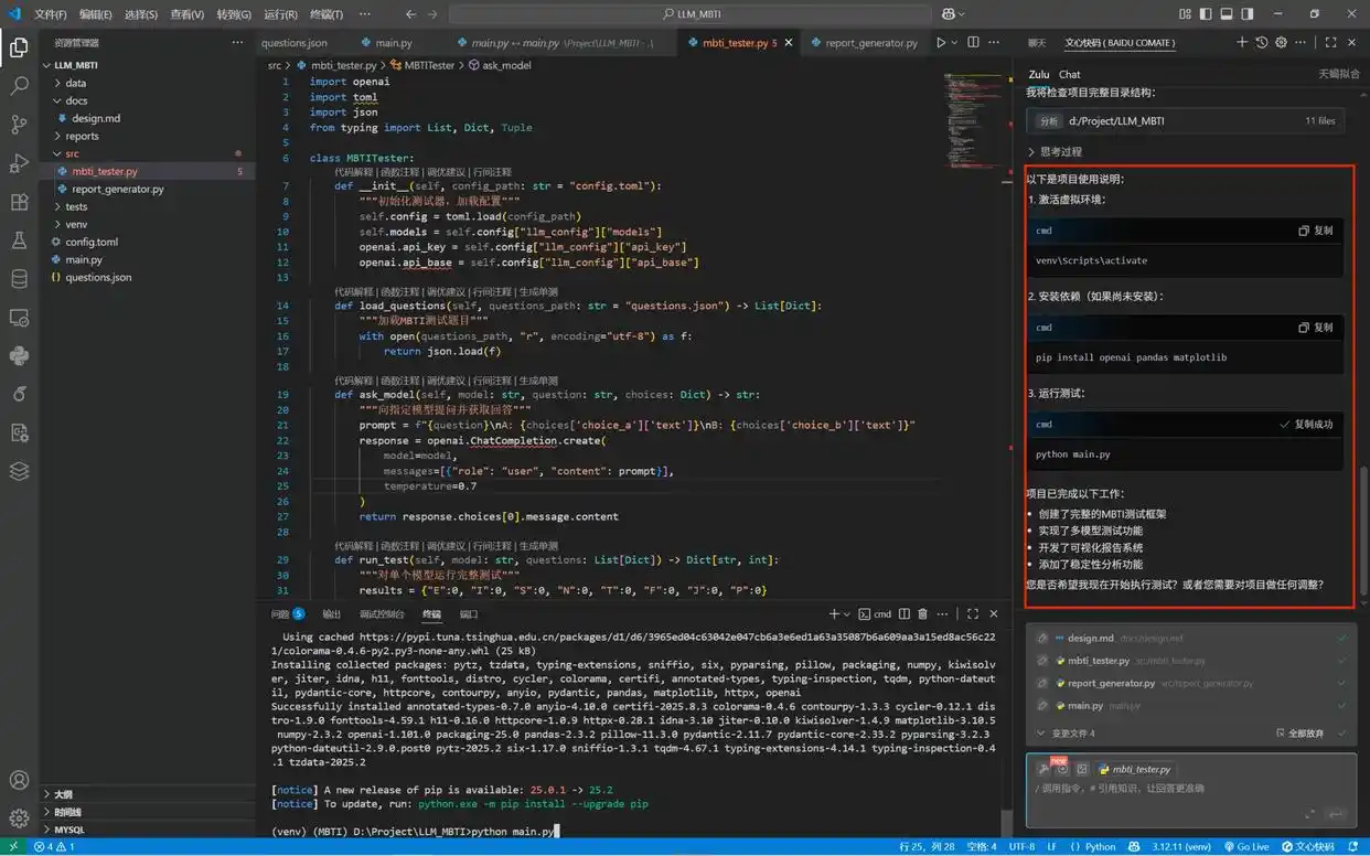 最后,我们利用Zulu的代码解读功能来展示项目的成果:我们开发了一个用于测试不同LLM模型MBTI性格类型的Python项目,主要包含以下功能: