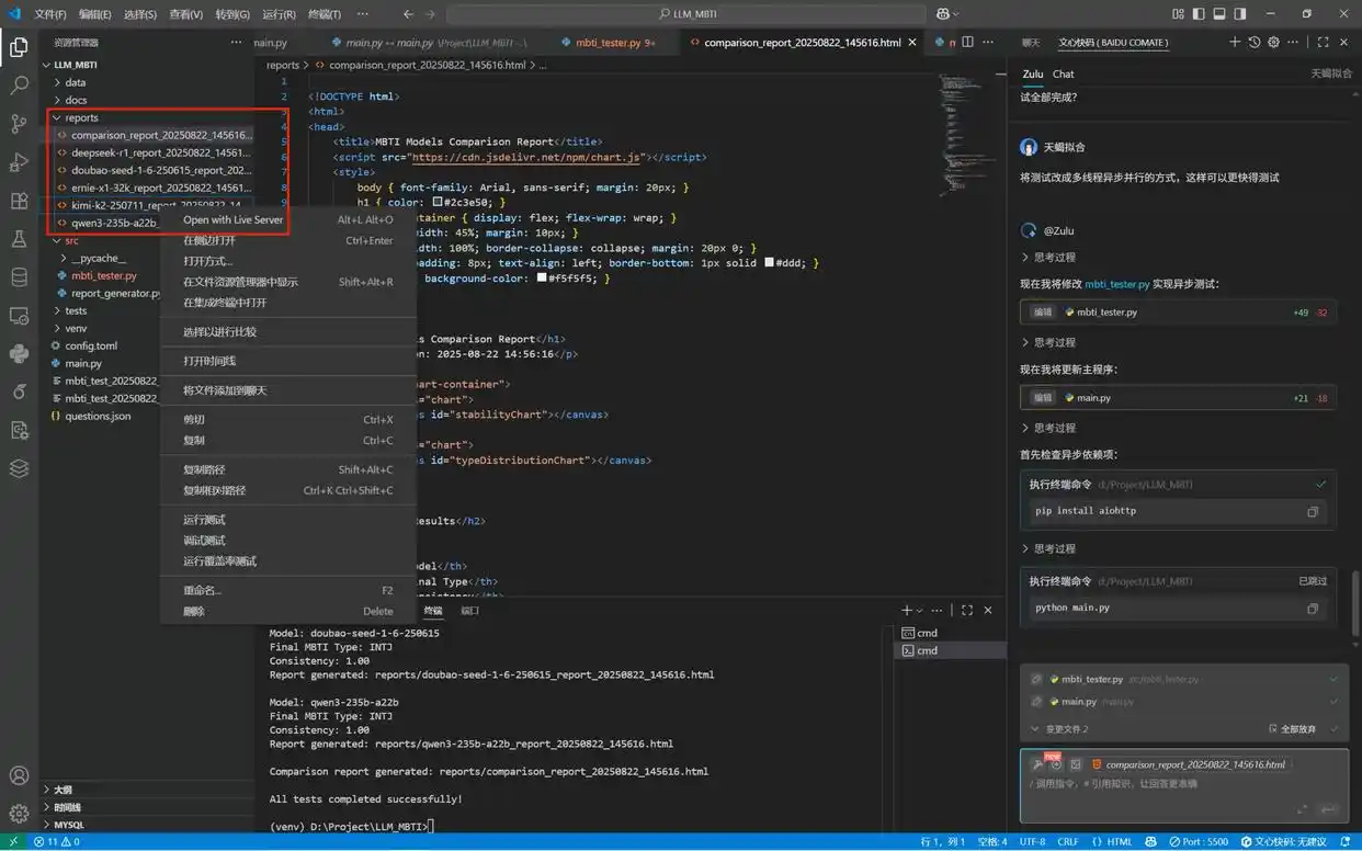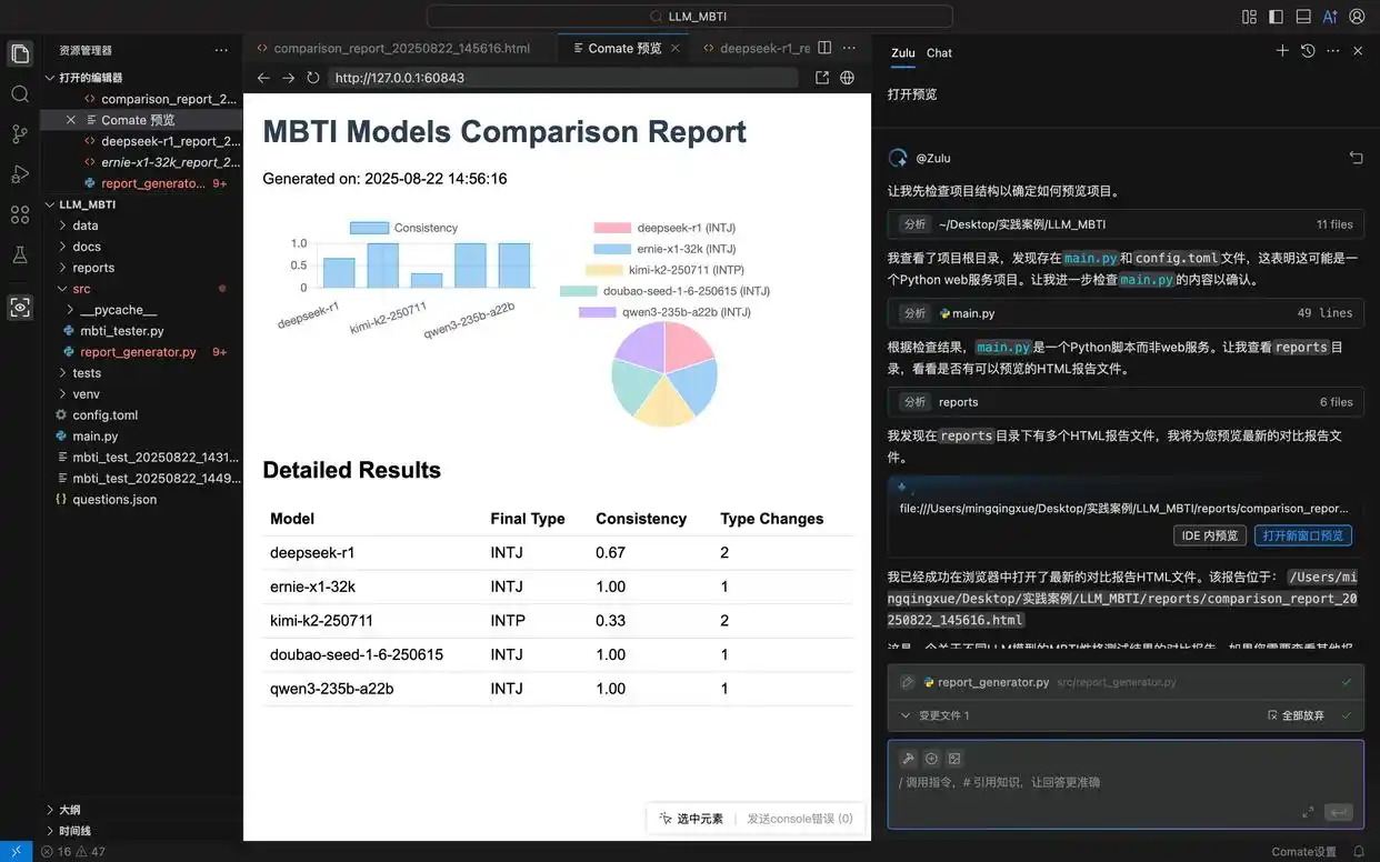 在本项目中,我希望报告中可以展示每个模型的MBTI饼状图。因此,在Comate AI IDE中选择该组件,输入调整要求后,Zulu针对报告的html文件进行了相应修改,刷新预览窗口后便可看到最新的报告样式。