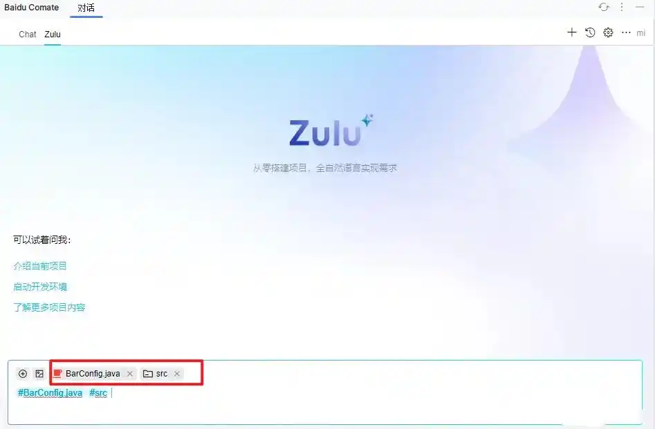 在文心快码中为Zulu添加上下文:目前Zulu支持文件、文件夹和项目级别的上下文。开发者可以通过 # 操作符调出当前索引的所有文件,并将其添加为当前会话的上下文。