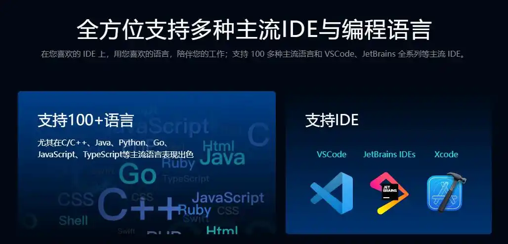 而支持的集成开发环境包括Visual Studio Code(兼容1.70及以上版本)、JetBrains IDE(兼容2021.1及以上版本,包括IntelliJ IDEA、PyCharm、GoLand、WebStorm等)、XCode和Visual Studio。