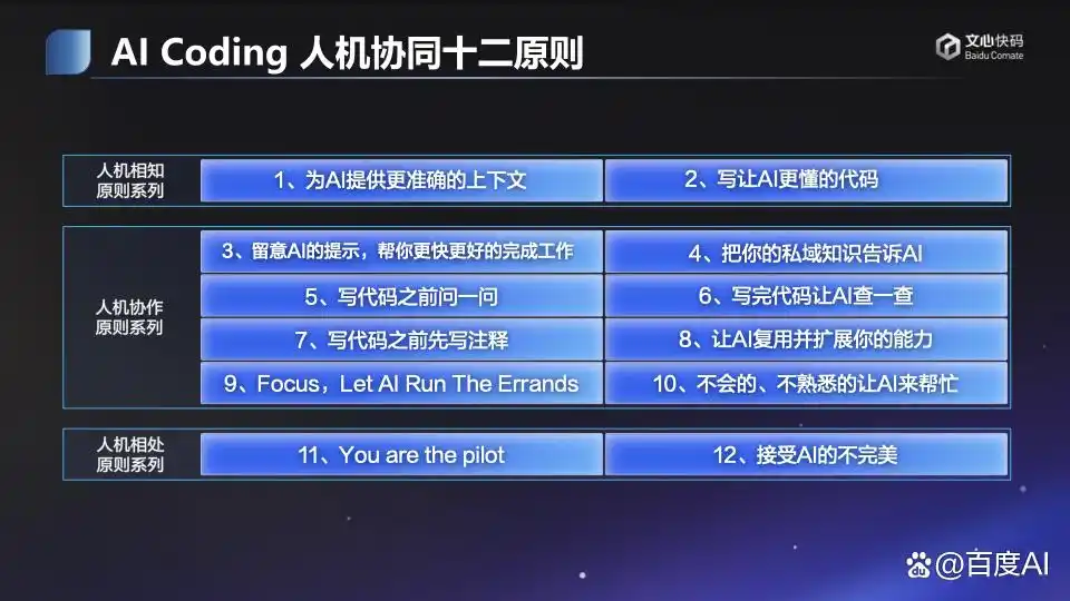 最后,他鼓励年轻开发者们,主动迎接变化,AI 时代的研发人才应当具备产品思维、精通技术架构、掌握人机协同的技巧,并善于利用 AI 解决问题,同时分享了“人机协同十二原则”,引起了现场开发者的广泛关注。