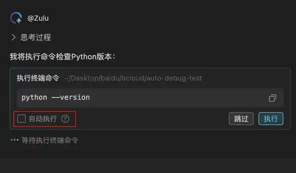 此外,文心快码的智能体现在于支持一键设置自动执行指令,这大大提高了 AI 生成与实际执行之间的流转效率。用户能够在同一终端会话中连续执行指令,从而减少打开新终端的频率,提升了操作的连贯性和资源利用的效率。