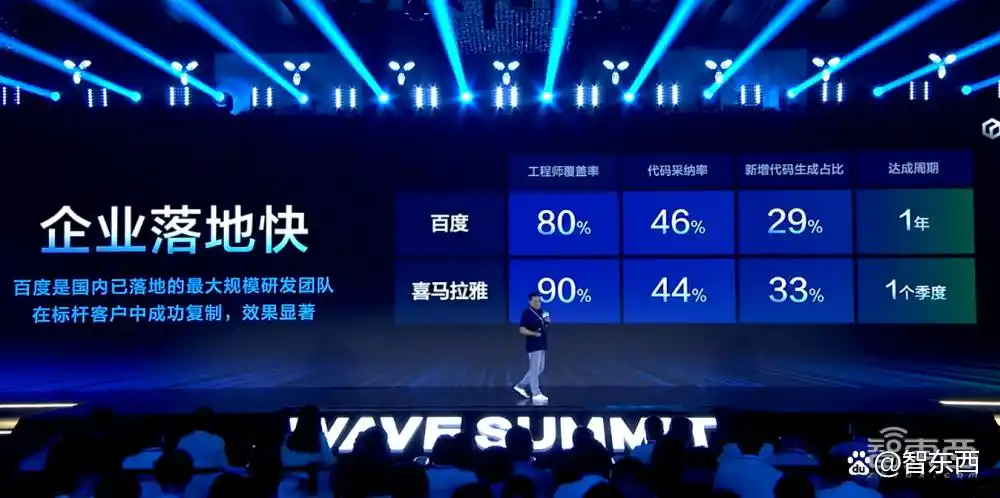 陈洋还分享了与标杆客户喜马拉雅的成功合作案例,该公司在仅一个季度内实现了90%的工程师覆盖率,代码采纳率为44%,新增代码生成占比则达到了33%。
