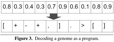 图3展示了从浮点数组中构建基因组的实例。每个值范围映射到编程语言中的特定指令。最初,这些值是随机的,导致生成的程序无法正常运行。但是,其中必将有一两个能够运行并执行一些有效的指令。一个程序执行得越成功,就越有可能继续使用代码,实现更成功的后代。