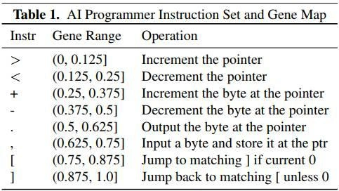 要使用遗传算法生成软件程序,必须首先创建一个基因组(genome)。基因组是一组被组合在一起作为单个单元的基因。AI Programmer的基因组编码为浮点数组,每个唯一指令的固定值范围在0和1之间,如上面表1的基因范围列所示。