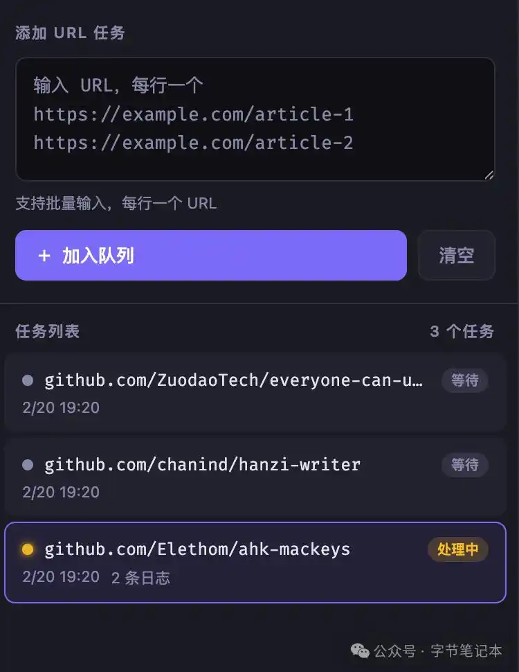 首先近千条网址内容的解析会有巨大的token消耗,第二个是它的运行不太稳定,第三个我需要一个更直观更详细的交互面板,不只是单纯报错结果,同时还需要能够实时统计和展示更详细的信息,最好过程中不断地增加新的内容,能查看解析的过程以及输出的结果。