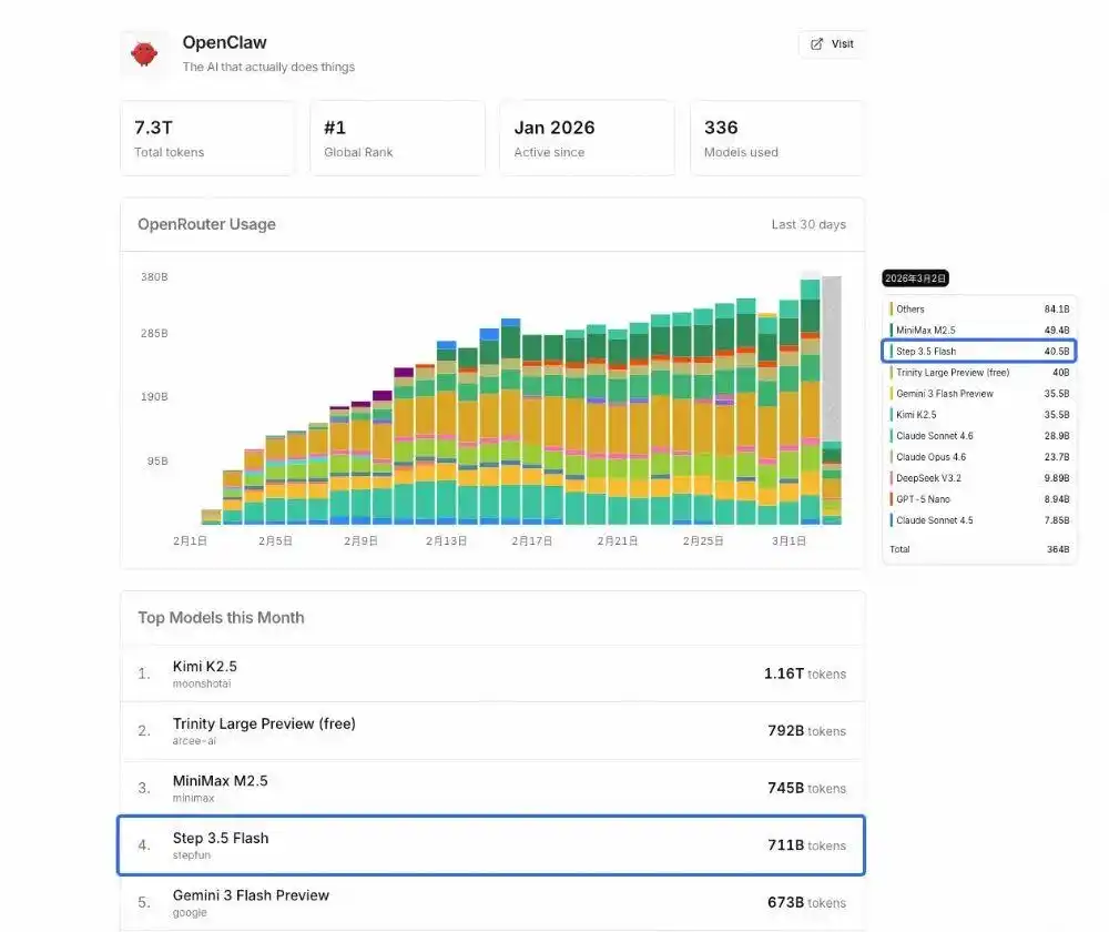 就在3月2日,国内大模型头部创企阶跃星辰在2月新开源的Agent基座模型Step 3.5 Flash单日调用量已超过40B,在OpenClaw的调用量榜中排名第二,超过Kimi K2.5、Gemini 3 Flash Preview、Claude Sonnet 4.5等一众国内外主流模型。