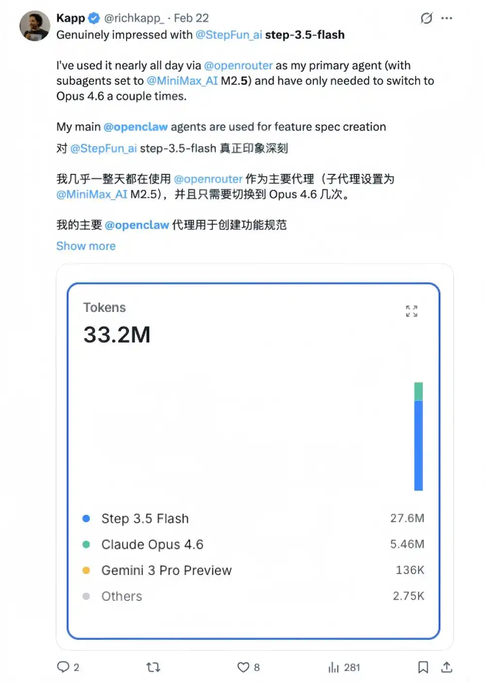 还有开发者赞叹说,Step 3.5 Flash速度十分惊艳,与OpenClaw的自然兼容性也很出色。